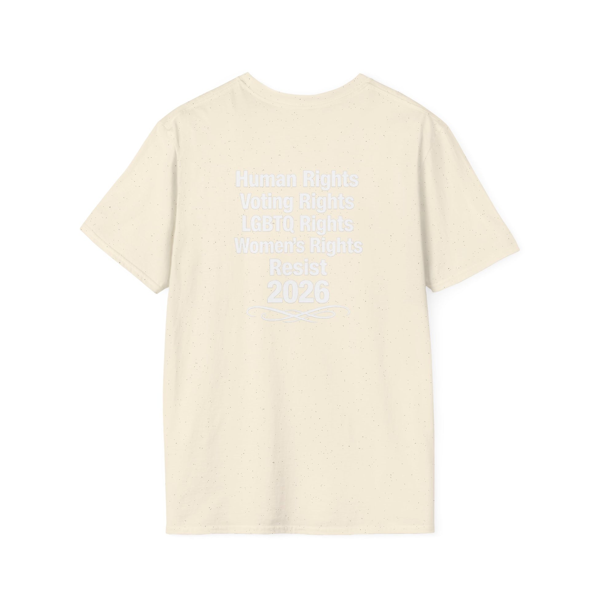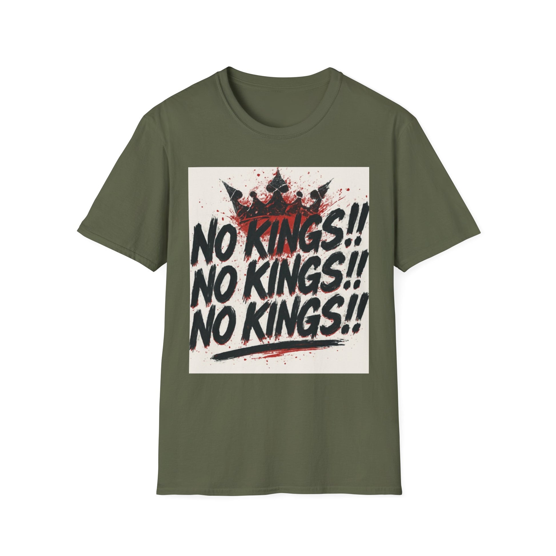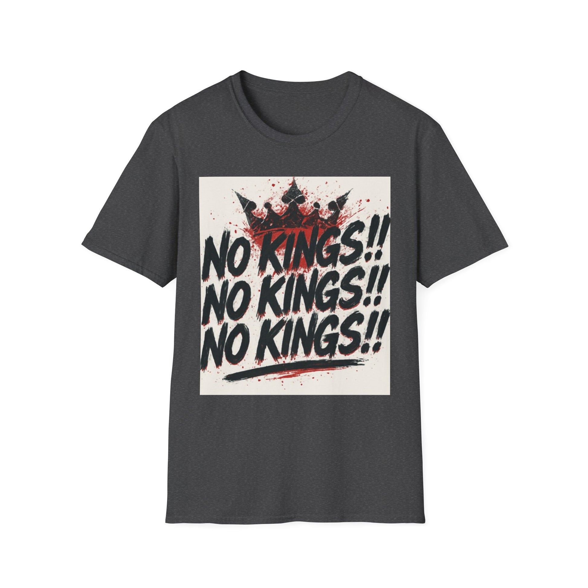 This tee carries a raw, rebellious energy — bold brush-stroke lettering declaring “NO KINGS!!” three times, stamped over a distressed crown and splattered paint. It lands like a shouted manifesto on soft, lightweight cotton. Wear it to shake up a quiet room, to match a streetwise outfit, or to hold up during protests and punk shows. The fit sits clean at the shoulders with a classic crew neck, so the message reads loud without the shirt getting in the way. It’s for people who prefer statement pieces that look lived-in from the first wear and keep their shape through repeat wear. The print’s slightly grungy texture pairs well with denim, layered flannels, and chunky boots — or under a leather jacket when you want something that’s equal parts attitude and everyday comfort.